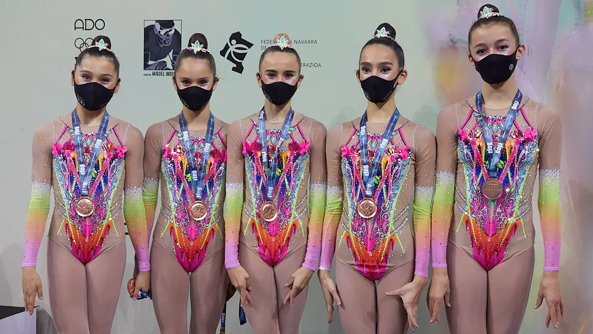 El equipo navarro júnior de Alaia ha quedado tercero en la final por aparatos de aros y cintas en el Campeonato de España de Gimnasia Rítmica celebrado en el Navarra Arena de Pamplona. IÑIGO ALZUGARAY