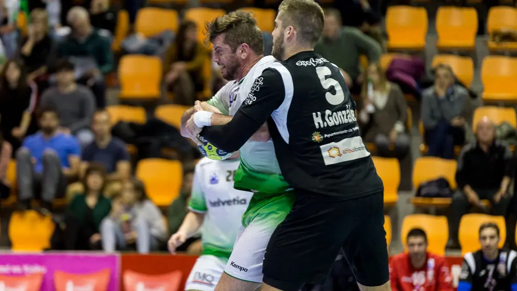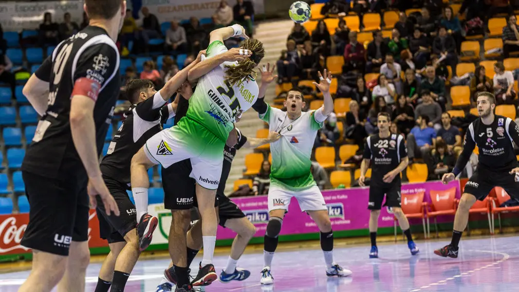 Espectáculo y goles en el pabellón Anaitasuna, entre Helvetia y Valladolid (39-36), jugado el miércoles 11 de abril de 2018.