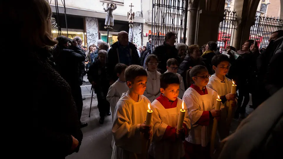 La figura del Ángel ha llegado a las 19.30 horas a la capital navarra y ha sido recibido por el 'angelico' de la Misericordia y al son del txistu.