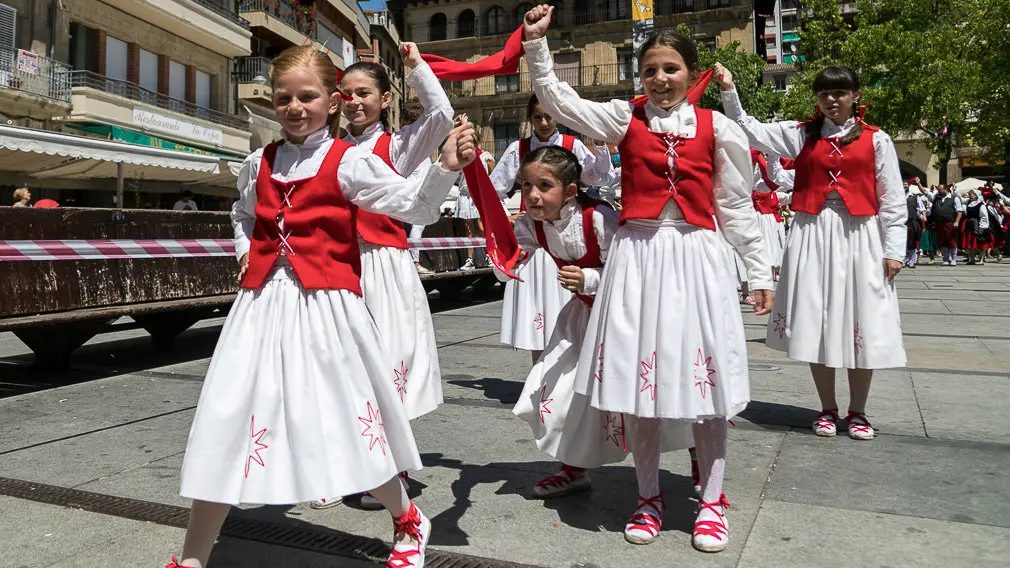 Baile de la Era en la plaza de los Fueros de Estella tras el chupinazo 2018. IÑIGO ALZUGARAY