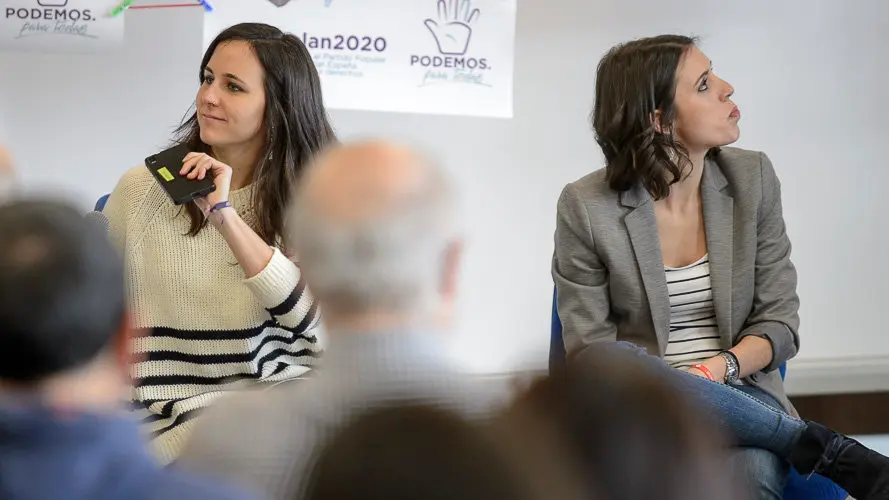 La portavoz adjunta de Podemos en el Congreso, Irene Montero (i), y la diputada Jone Belarra, en Ansoáin en un encuentro en el que presentan el "Plan 2020" para ganar las elecciones al PP. EFE/Villar López