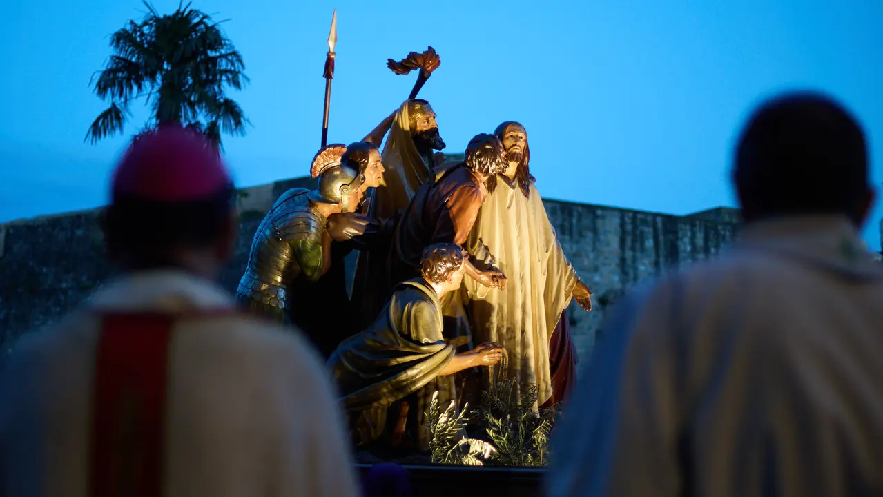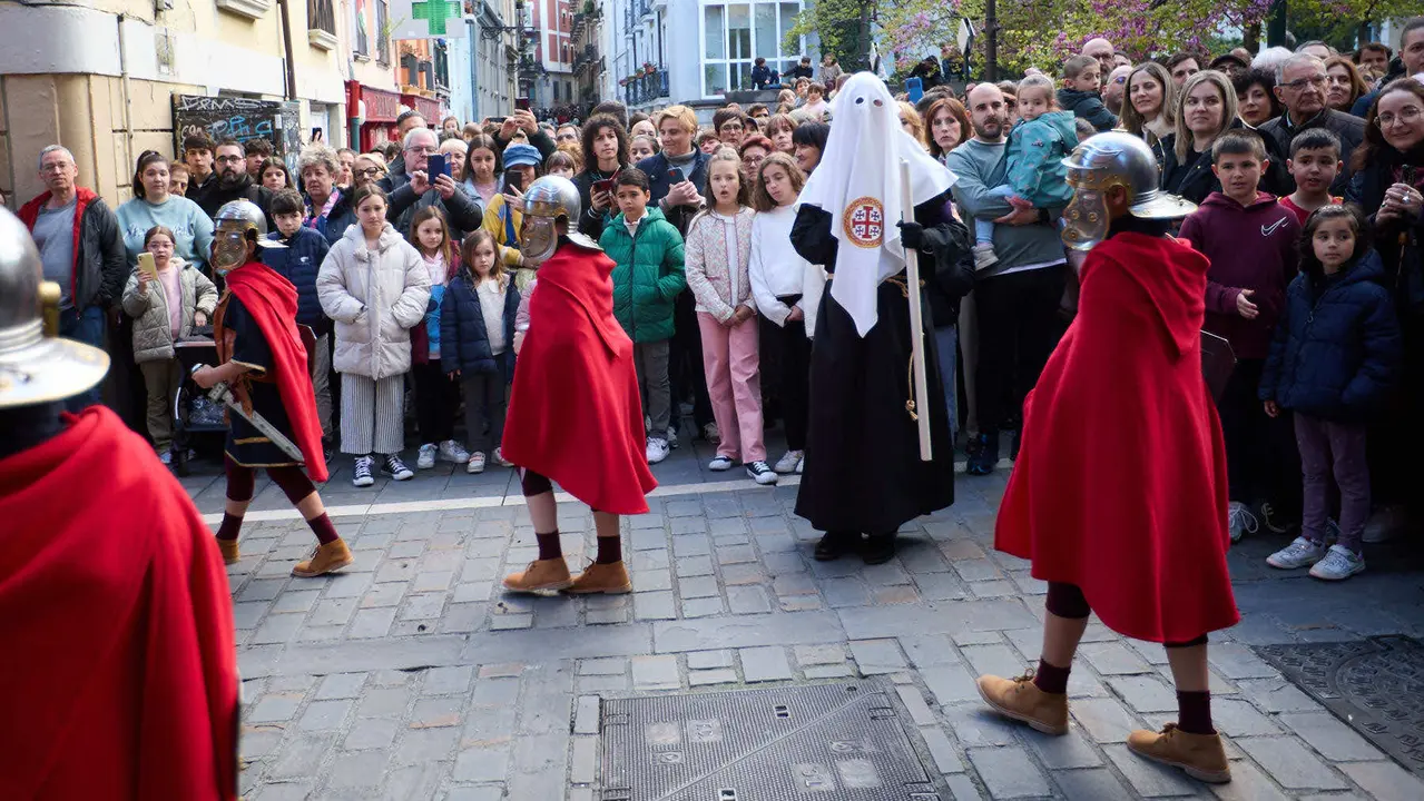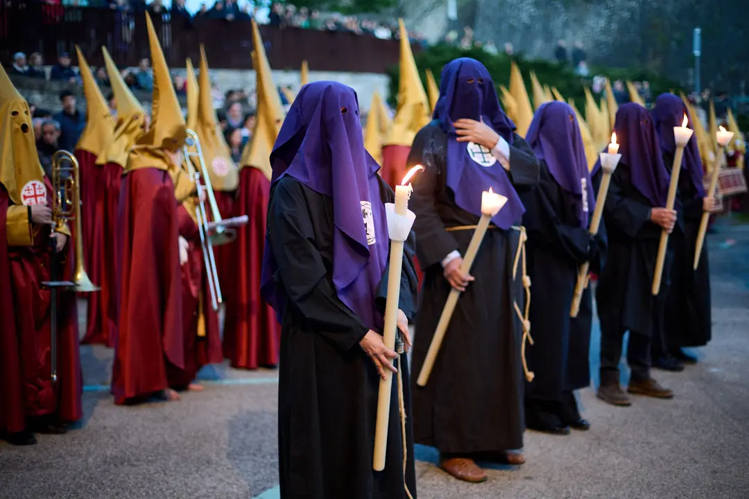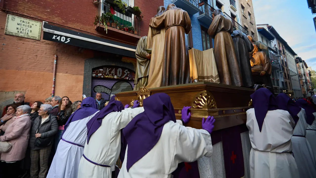 La procesión de Jueves Santo ha recorrido este jueves las calles del Casco Antiguo de Pamplona en un ambiente de recogimiento y solemnidad. A las 20:00 horas ha partido desde la calle Dormitalería, acompañada por la banda de cornetas y tambores de la Flagelación de Logroño, que ha aportado un acompañamiento sonoro cargado de intensidad y emoción. Durante el trayecto, los pasos han atravesado las calles Javier, Merced y Juan de Labrit hasta llegar a la plaza de Santa María la Real, donde se ha celebrado un acto de oración.