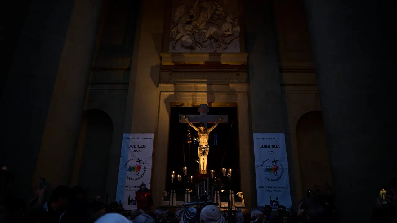 El mal tiempo ha obligado a suspender la tradicional procesión de Viernes Santo de Pamplona por segundo año consecutivo. En su lugar, se ha celebrado un Vía Crucis a cubierto en la Catedral de la capital navarra.