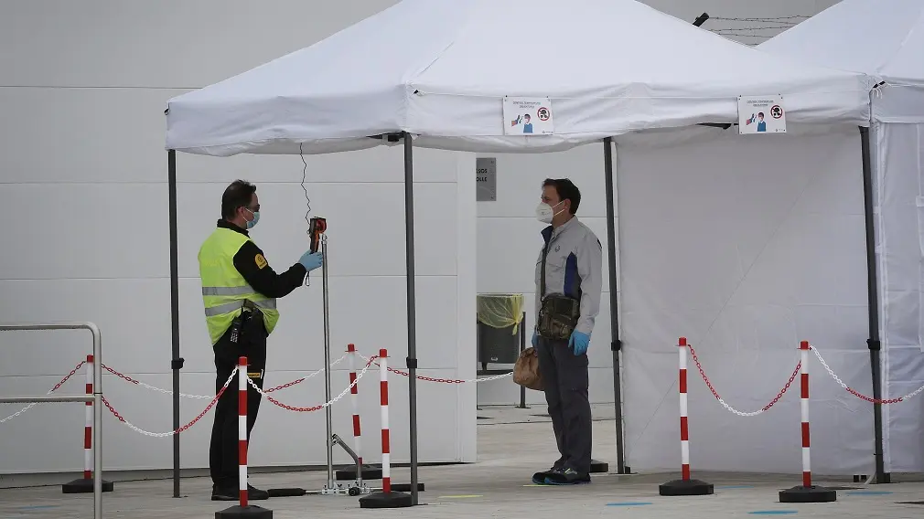 Momento en el que se le toma la temperatura a uno de los trabajadores antes de entrar a la factoría alemana en Navarra. EFE/ Villar López