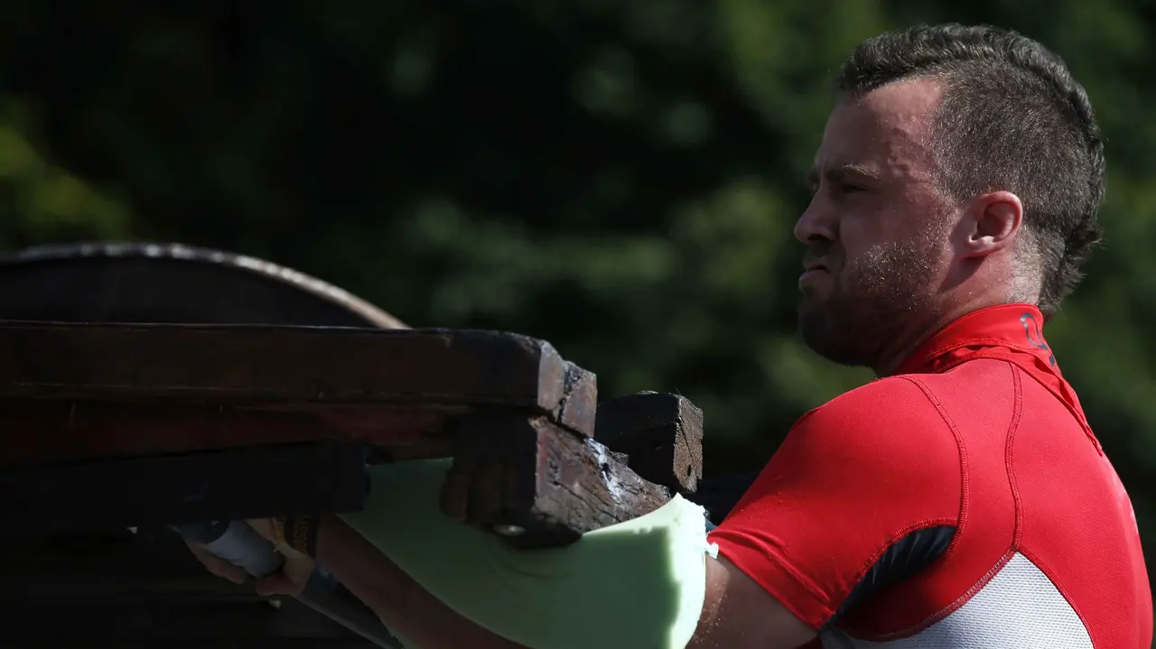 Un entrenador marca las trayectorias de corte, durante el Campeonato navarro de Aizkora (hacha), con troncos de madera de haya, en la plaza de los Fueros, dentro de las fiestas de San Fermín, en la capital pamplonica. EFE/Javier Lizón