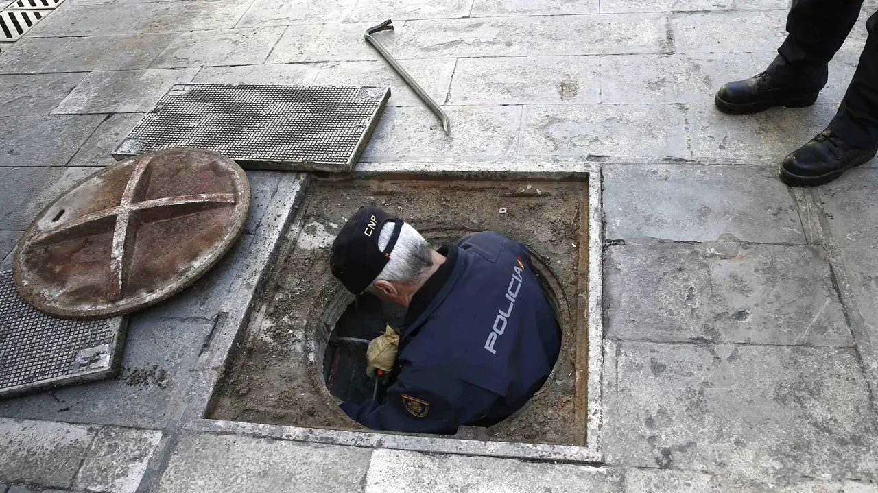 La Unidad de Subsuelo de la Policía Nacional termina de inspeccionar el alcantarillado del Casco Viejo de la Ciudad para proceder al sellado de las tapas de la Plaza del Ayuntamiento de Pamplona donde el próximo jueves se darán cita miles de personas con el lanzamiento del cohete anunciador de las fiestas de San Fermin 2017. EFE/Jesús Diges