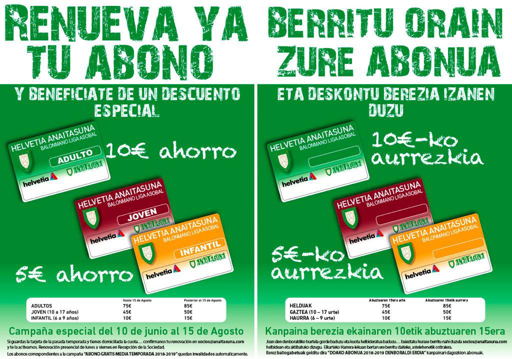 Helvetia Anaitasuna ha puesto a disposición de sus socios una campaña para renovar los abonos de la pasada campaña con un precio especial.