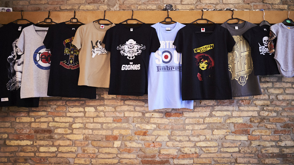 Perchas con las diferentes camisetas de grupos de música que se venden en la tienda. PABLO LASAOSA