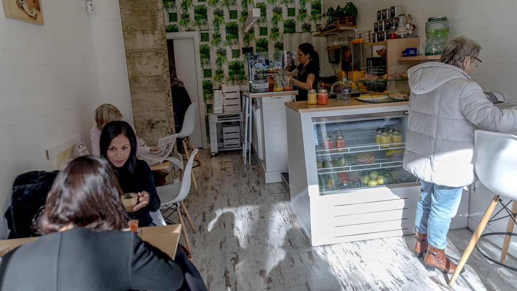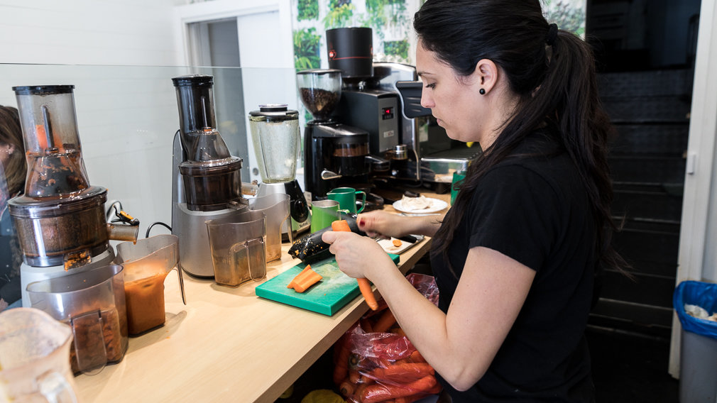 "El detox funciona bien, tiene acelga, apio, piña y manzana. Pero no hacemos milagros, por tomarte un detox no vas a perder 20 kilos. El zumo no hace magia", ríe la propietaria.