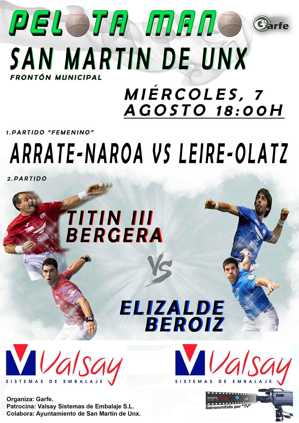 Para contribuir con las fiestas patronales de San Martín de Unx, ambas empresas navarras junto al consistorio del pueblo han organizado los dos partidos en los que los jugadores participarán por parejas: en el femenino, Arrate y Naroa competirán contra Leire y Olatz y, una vez terminado, Titín III y Bergera se enfrentarán a Elizalde y Beroiz en el masculino.