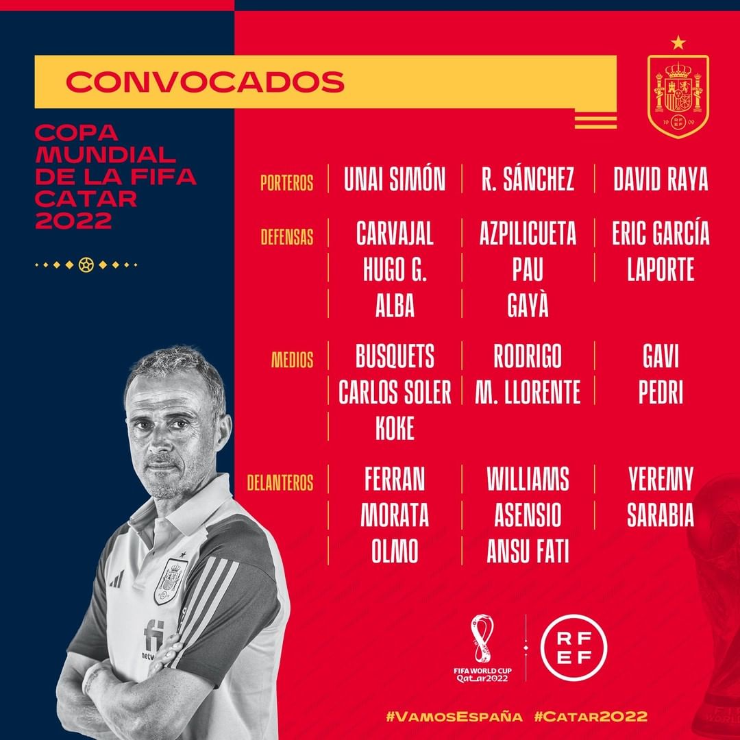 La lista completa de España para el Mundial de Catar 2022 es la siguiente: