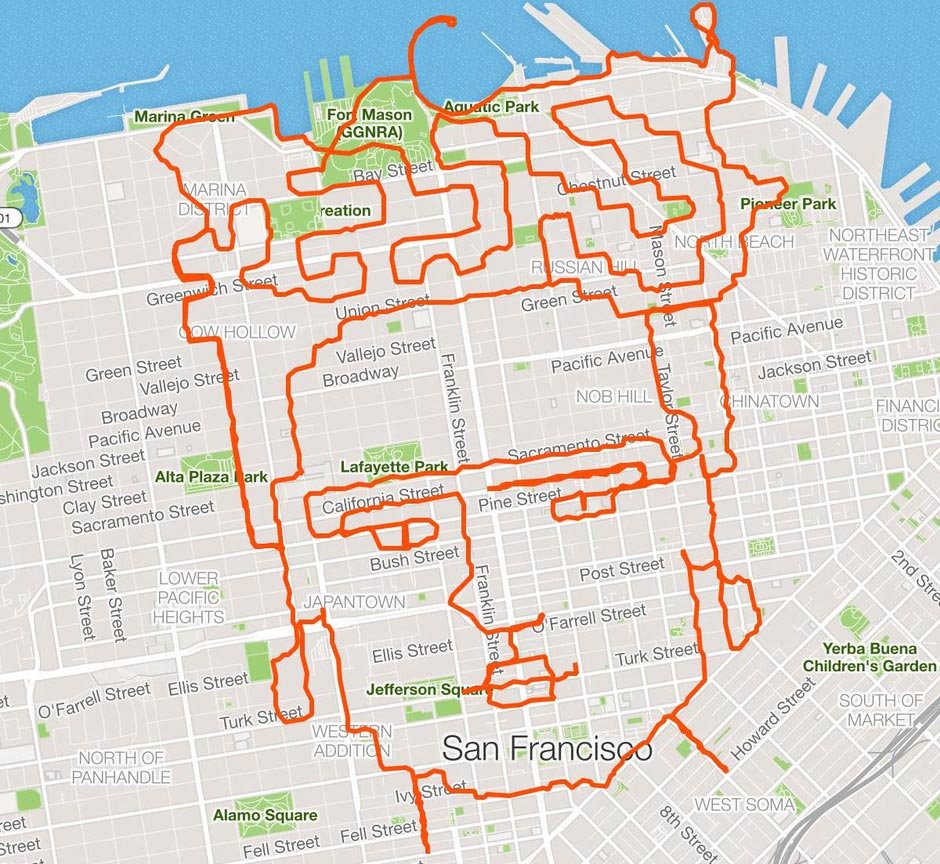 El atleta californiano Lenny Maughan ha revolucionado las redes sociales gracias a la original práctica deportiva que ejerce sobre su ciudad natal, San Francisco. Se trata de un corredor o 'runner' aficionado a patearse las calles de la gran ciudad con un propósito novedoso: formar ilustraciones a partir de cada recorrido.