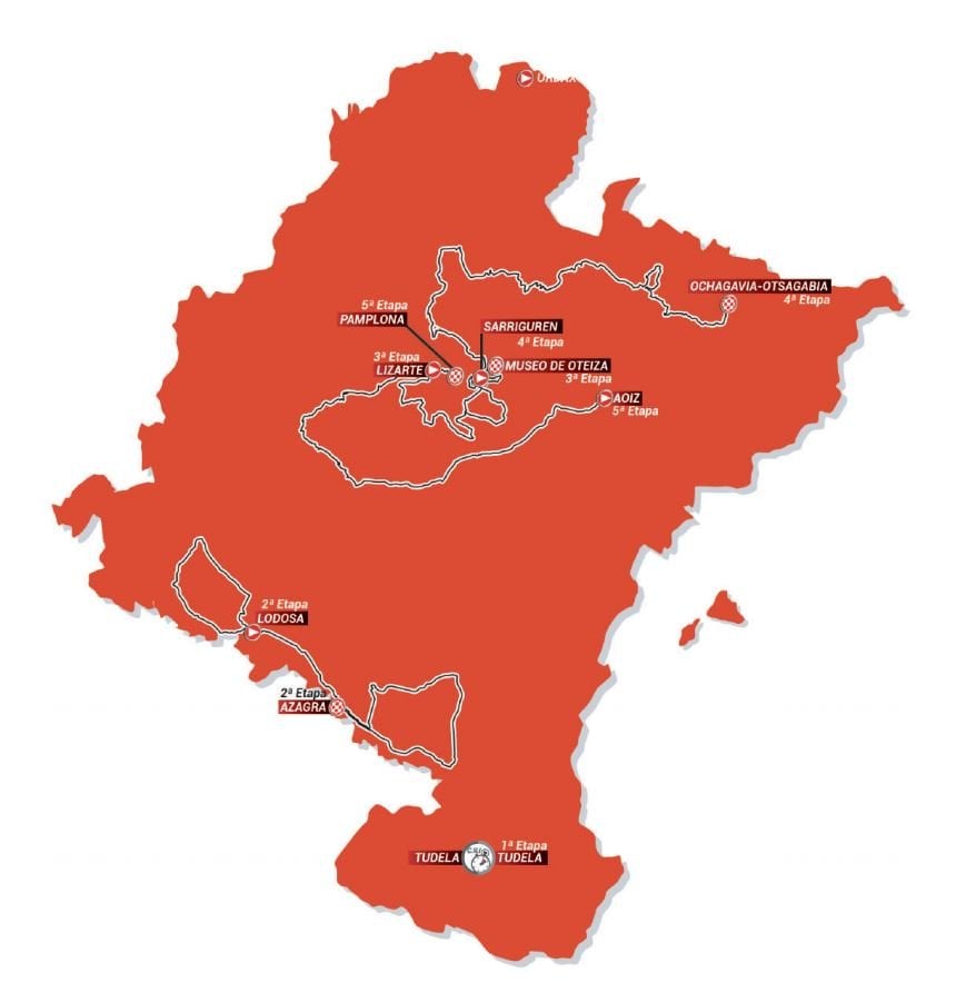 La primera etapa se disputará este miércoles con salida y meta en Tudela. Será una contrarreloj individual con final sobre las 20 horas. La segunda tendrá lugar este jueves entre Tudela y Azagra. La tercera terminará este viernes en el Museo Oteiza de Alzuza, la cuarta será la etapa reina con final espectacular en Ochagavía con el alto de Muskilda, y la última volverá a la tradicional meta en San Lorenzo junto a la Taconera.