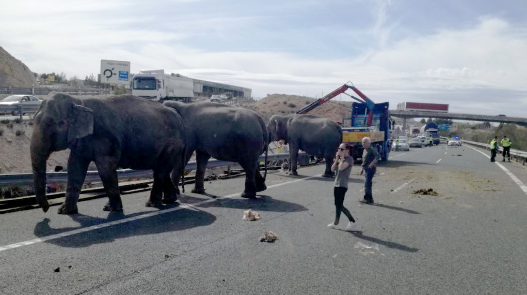 Imagen del accidente de un camión que transportaba elefantes en la A30, en Albacete, y cómo han quedado libres por la calzada ante la atenta mirada de decenas de curiosos que se han detenido en el punto del accidente. Foto: Twitter @iualcabon