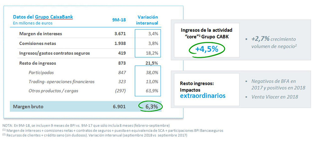 Los ingresos core del negocio (margen de intereses, comisiones, ingresos del negocio de seguros, puesta en equivalencia de SegurCaixa Adeslas y las participaciones de BPI Bancaseguros) aumentan un 4,5%, y el total de los ingresos un 6,3%.