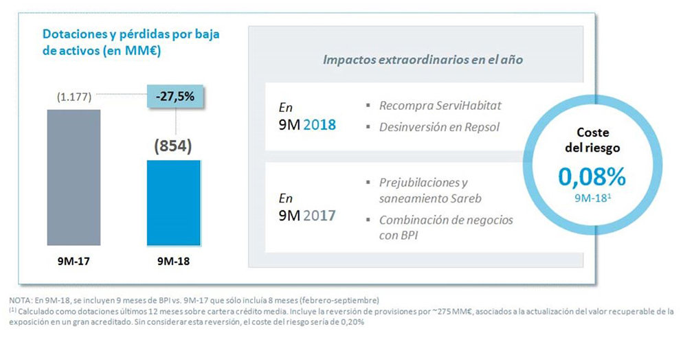 En el proceso de normalización de los indicadores de actividad del activo, las pérdidas por deterioro de activos financieros y otras provisiones disminuyen un 74,1% respecto al mismo periodo de 2017, hasta los 377 millones.