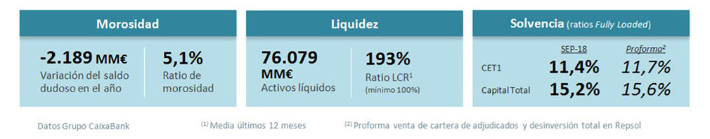 La ratio de morosidad del Grupo CaixaBank se reduce hasta el 5,1% (6,4% en septiembre de 2017 y 6% en diciembre de 2017). Los saldos dudosos descienden hasta los 12.116 millones (-598 y -2.189 millones en el trimestre y desde diciembre, respectivamente), tras la gestión activa, que incluye la venta de carteras.