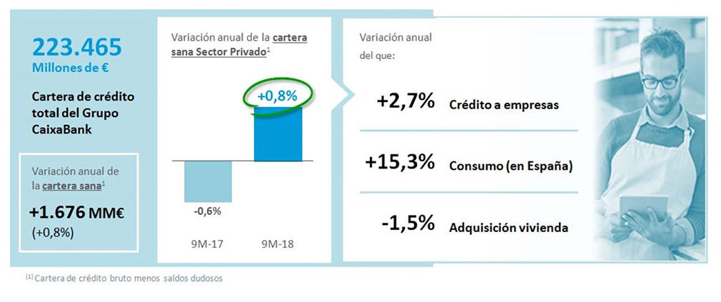 En el Grupo, el crédito bruto a la clientela se sitúa en 223.465 millones y se mantiene estable (-0,2% en el año). La cartera sana del sector privado crece un 0,8% en 2018 (vs -0,6% en el mismo periodo de 2017).