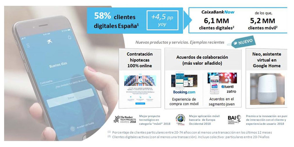 Recientemente, CaixaBank ha sido elegido como ‘Mejor Banco Digital de Europa Occidental’ por la revista británica Euromoney, y ha sido premiado por The Banker y por el Bank Administration Institute (BAI) por su aplicación móvil, ‘CaixaBank Now App’, reconociendo la transformación digital y la apuesta por la innovación tecnológica.