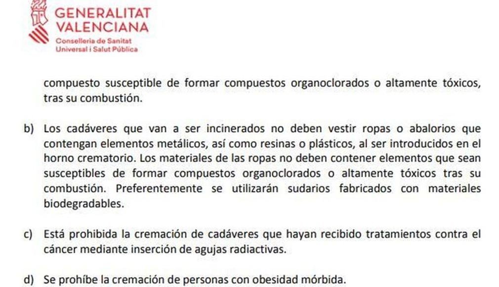 La orden propuesta por la Conselleria de Sanidad Universal y Salud Pública de la Comunidad sobre "revisión y actualización de los requisitos sanitarios para la ubicación y funcionamiento de los hornos crematorios" hace que si se aprueba sea difícil decidir qué se quiere hacer con un ser querido en caso de que padezca obesidad mórbida.