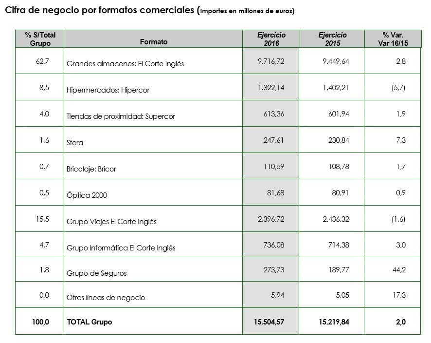 El formato de grandes almacenes constituye la principal actividad dentro del Grupo con una aportación a la cifra de negocios del 62,7% y una cifra de negocios de 9.716,72 millones de euros, lo que supone un incremento del 2,8% sobre el año anterior. El Ebitda superó los 652,2 millones de euros, un 20,6% más que el ejercicio precedente.