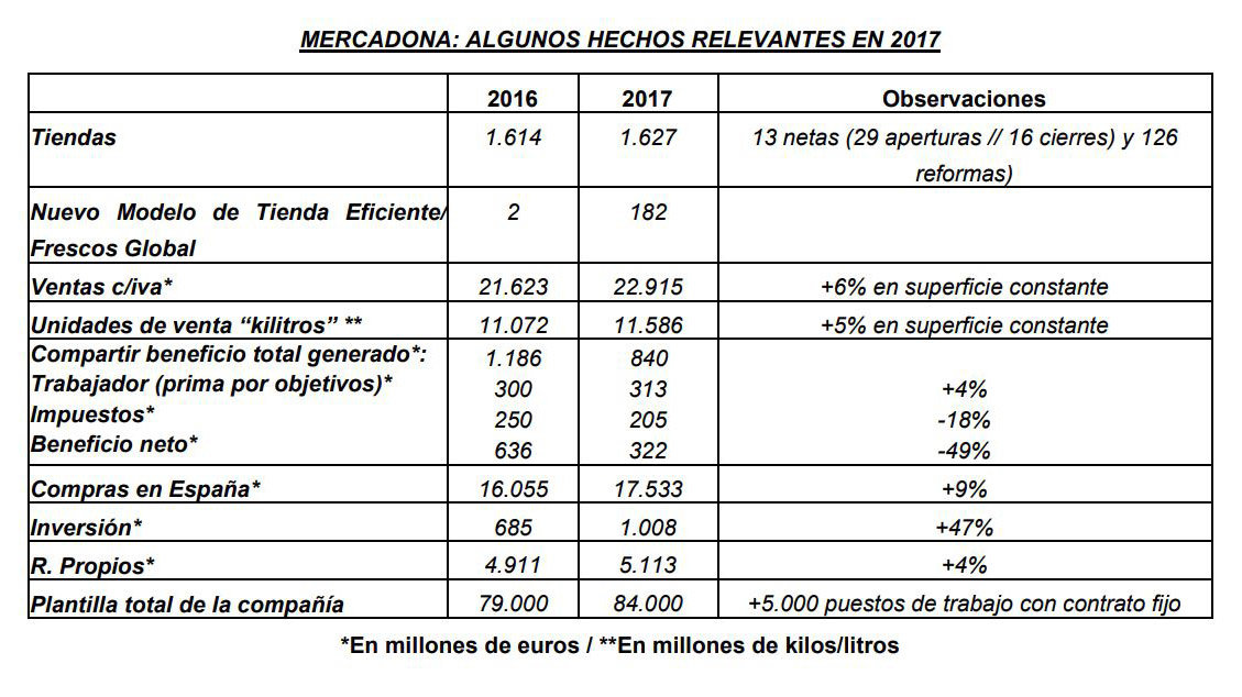 Mercadona incrementó en 2017 su facturación un 6%, hasta los 22.915 millones y creó 5.000 empleos fijos