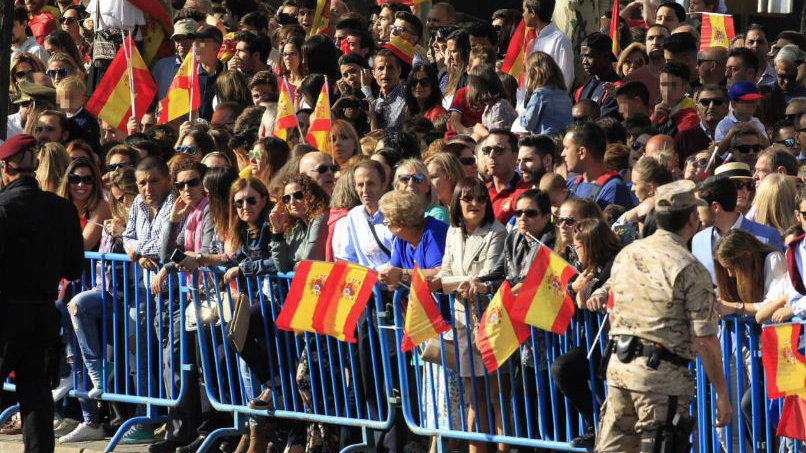 Miles de personas han salido este jueves a la calle para asistir al desfile que se celebra con motivo de la Fiesta del Día Nacional, inundando con la bandera de España el Paseo de la Castellana de Madrid en pleno conflicto por el desafío independentista catalán.