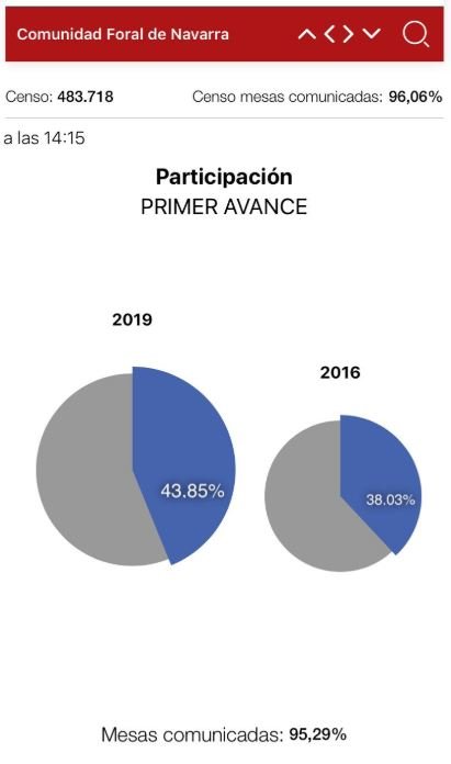 Los datos indican que a esa hora de la tarde había votado ya el 43,85% de la población llamada a depositar su voto en los colegios electorales de Navarra (210.465 personas), cuyo censo electoral es de 483.718 ciudadanos.