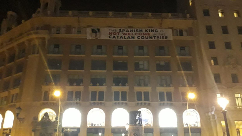Además, en la fachada del número 9 de Plaza Cataluña, donde este viernes se han celebrado los actos de homenaje a las víctimas de los atentados en Barcelona y Cambrils (a los que han acudido los Reyes) se ha desplegado una pancarta contra Felipe VI bajo el lema "The spanish King is not welcome in the catalan countries" (El Rey de España no es bienvenido en los países catalanes).