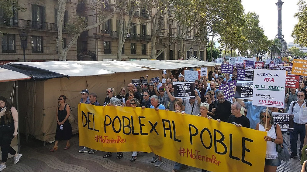 Del mismo modo, en la esquina entre la Rambla y la calle Hospital se ha desplegado otra pancarta en la que se podía leer "Their wars, our deaths. Catalonia in solidarity with the victims" (Sus guerras, nuestros muertos. Cataluña en solidaridad con las victimas). Este mensaje va acompañado de una bandera estelada y una imagen del Rey Felpie VI dando la mano a un jeque.