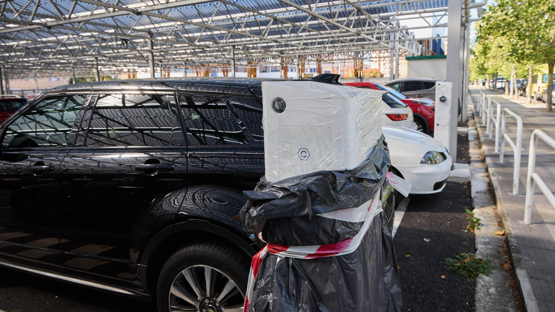 El parking disuasorio de la Rochapea, junto al colegio Cardenal Ilundáin, sigue con sus cargadores de coches eléctricos embalados casi dos años después de su inauguración. La instalación fue remodelada en 2023 con una cubierta y placas solares, pero a día de hoy continúa sin estar operativa.