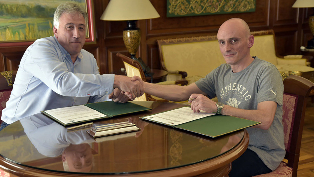 El alcalde de Pamplona, Joseba Asirón, y el presidente de la DYA de la base de Pamplona, Eneko Arteaga, han suscrito el documento que avalará la participación de esta organización durante el año 2018 en actuaciones de los planes de protección civil de los Sanfermines y de nevadas e inundaciones, así como el apoyo sanitario, social y logístico de la organización en otras situaciones con los medios y recursos establecidos en el texto.