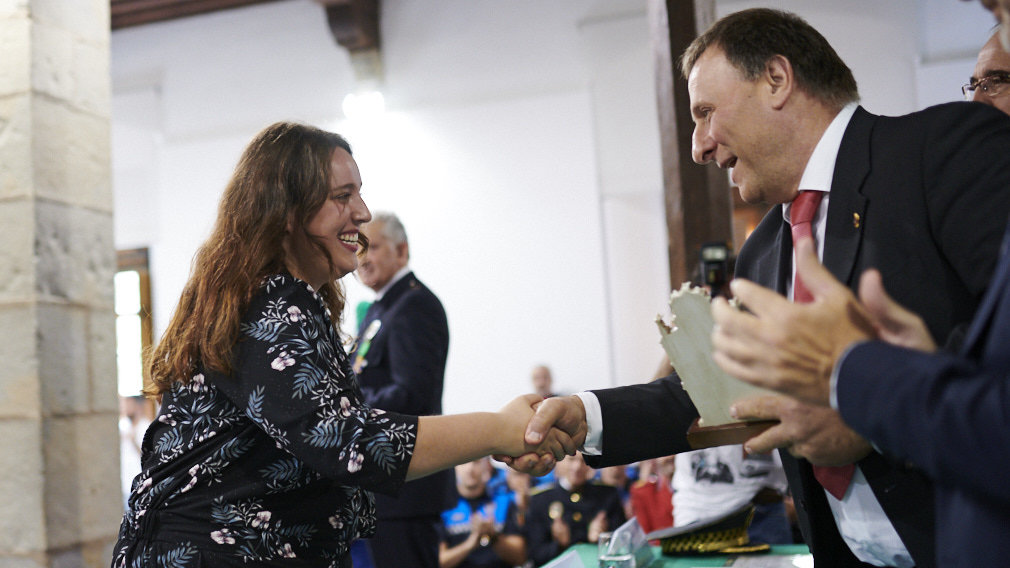 Teresa Ezponda recibiendo este lunes el reconocimiento público tras salvar a un bebé. PABLO LASAOSA