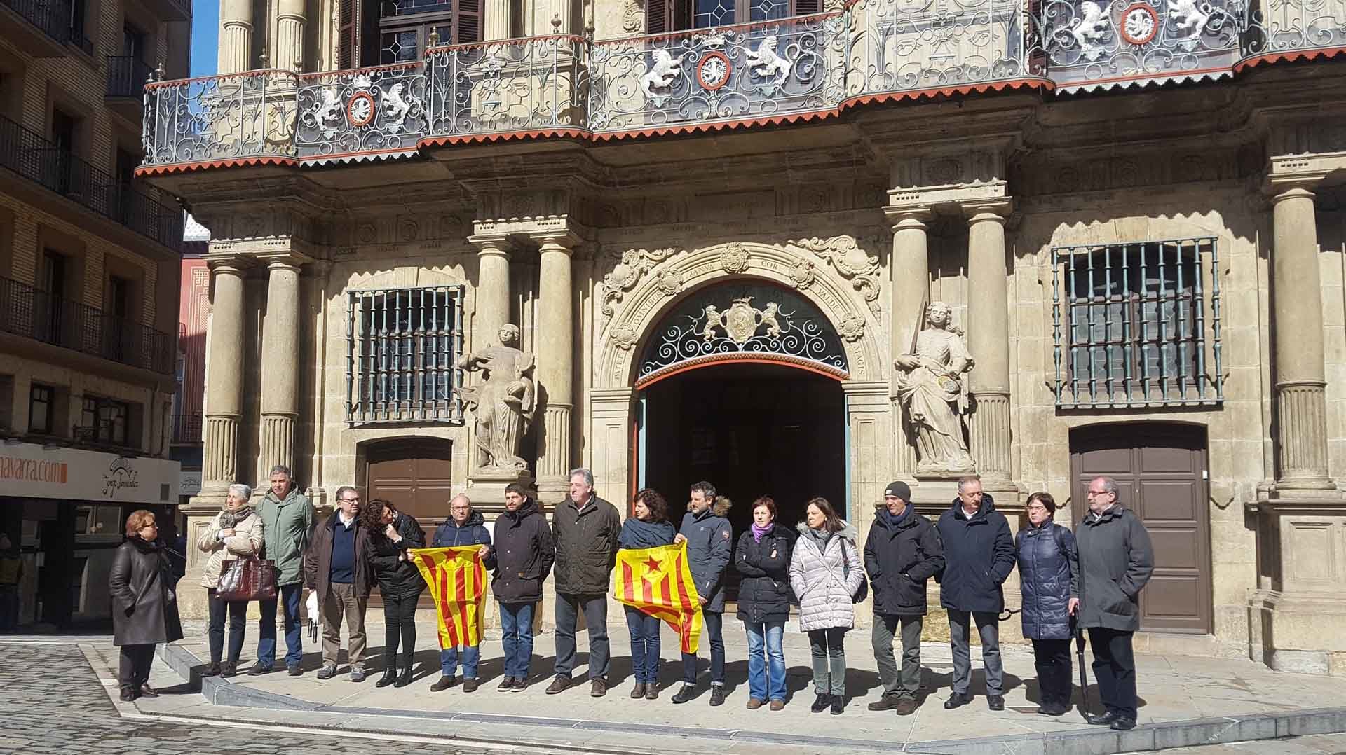 El cuatripartito del Gobierno de Navarra y del Ayuntamiento de Pamplona se han manifestado este lunes en la Plaza Consistorial y frente a la Cámara foral para denunciar la "situación de excepcionalidad democrática" que aseguran que se está viviendo en Cataluña.