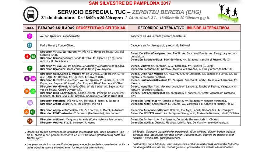 Todas las líneas del Transporte Urbano Comarcal (TUC) a su paso por Pamplona, excepto las líneas 1, 2, 6, 19, 20, 22, 23 Y 25, sufrirán modificaciones en su recorrido y se verán afectadas en sus frecuencias horarias habituales este domingo 31 de diciembre, de 18.00 horas a 20.30 horas aproximadamente, debido a la celebración de la carrera San Silvestre que recorrerá las calles del centro de Pamplona.