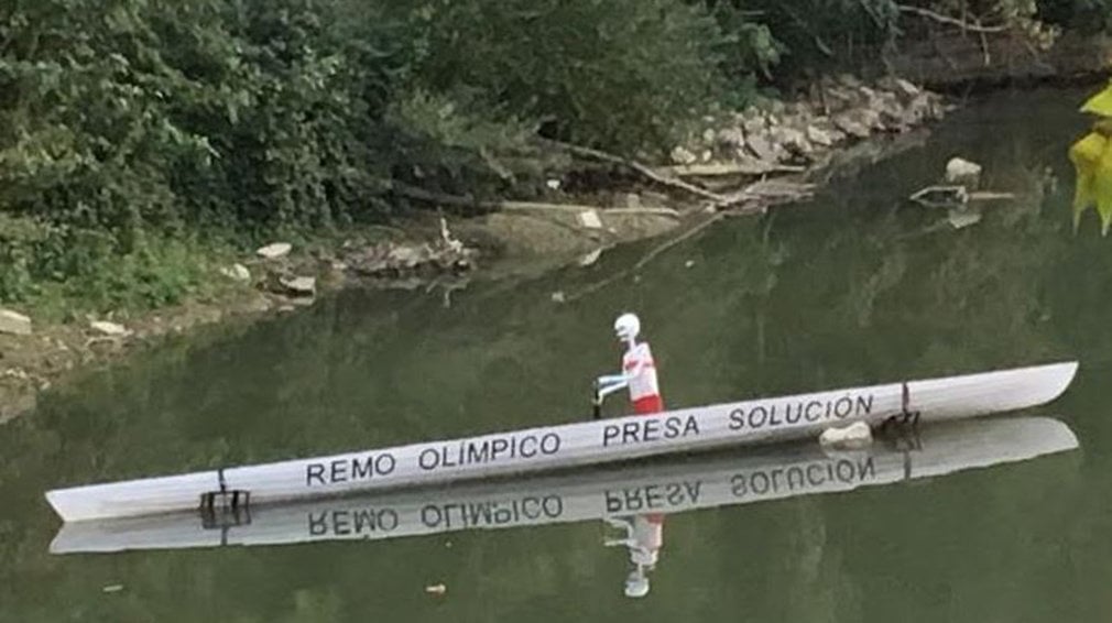 El esqueleto con el que el Club de Remo de Navarra protesta por la situación de la presa. CEDIDA