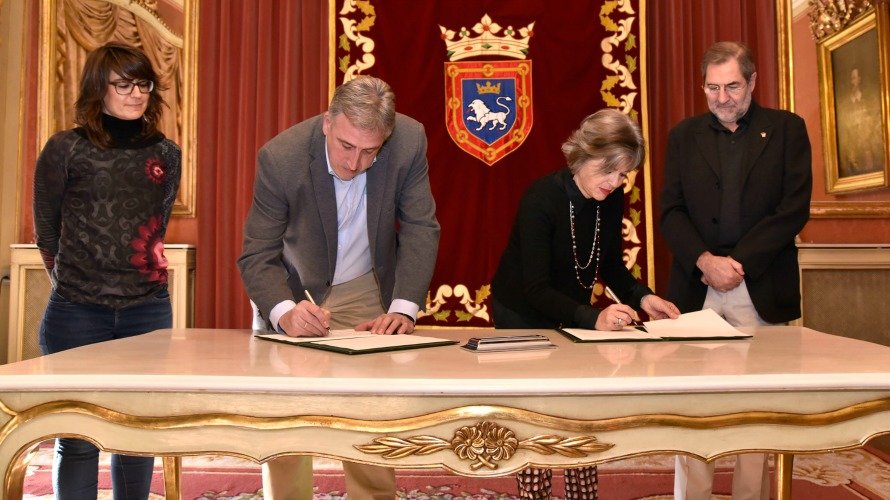 Helena Fernandino y Emilio Pi, oriundos de Pamplona y propietarios de esta colección artística, han firmado con el alcalde de la ciudad, Joseba Asirón, un contrato de cesión temporal al Consistorio de 87 obras de sus fondos. En el acto de firma ha estado presente también la concejala delegada de Cultura, Política Lingüística, Educación y Deporte, Maider Beloki.