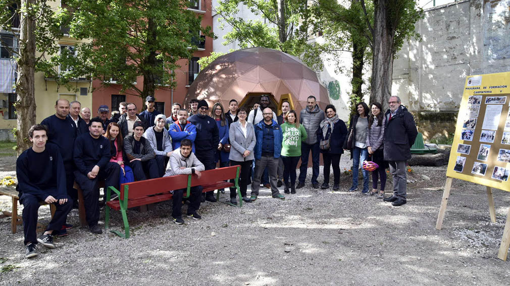 El ‘domo’ es una cúpula geodésica compuesta por 160 triángulos de madera que ha sido realizada por personas usuarias del programa de Carpintería y Mueble del Ayuntamiento de Pamplona, un programa de formación para el empleo de 12 meses realizado íntegramente con fondos municipales que terminó a finales del pasado marzo.