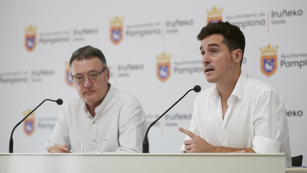 Patxi Leuza y Antso Fernández de Geroa Bai en rueda de prensa en el Ayuntamiento de Pamplona.PABLO LASAOSA