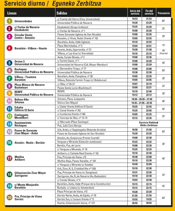Sin embargo, las líneas 12 de Ermitagaña a Mendillorri y la 18 que conecta Zizur Mayor con Sarriguren tendrán una frecuencia de 25 minutos durante la jornada.