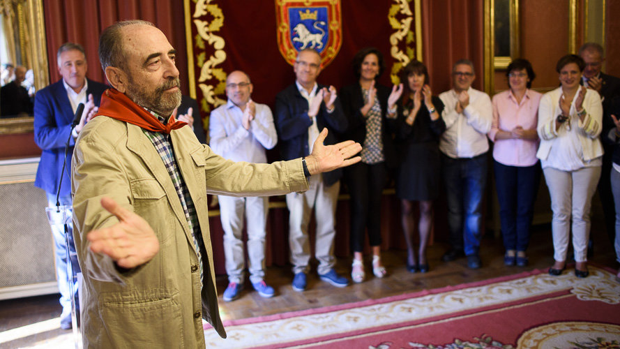 Durante su discurso, Javier Pagola ha manifestado que le ha alegrado "saber que la felicitación y el acuerdo sean parecer común de todos los grupos políticos municipales" y ha valorado que el Ayuntamiento reconozca su trayectoria de "servicio a la ciudadanía".