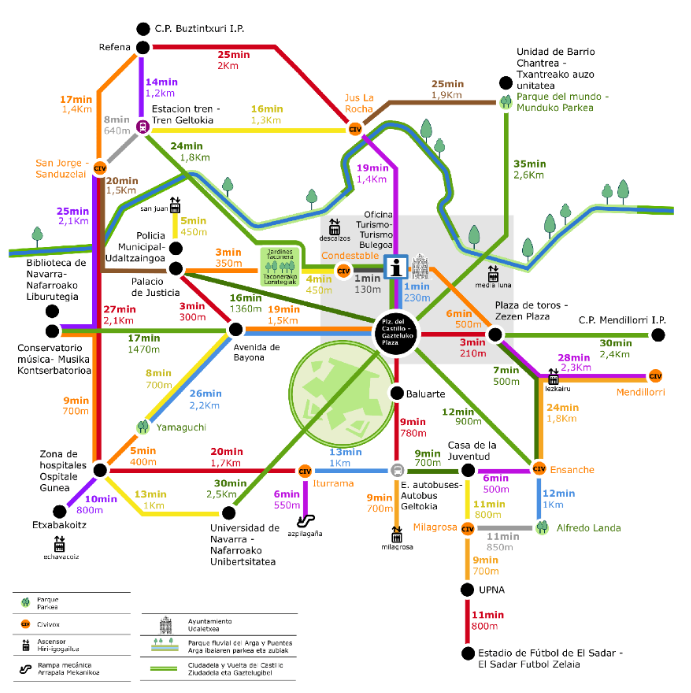 Así, es sencillo calcular que desde la Plaza del Castillo hasta la Universidad de Navarra (2,5 kilómetros) se llega en apenas 30 minutos y al conservatorio de música, en 36 minutos (3 kilómetros).