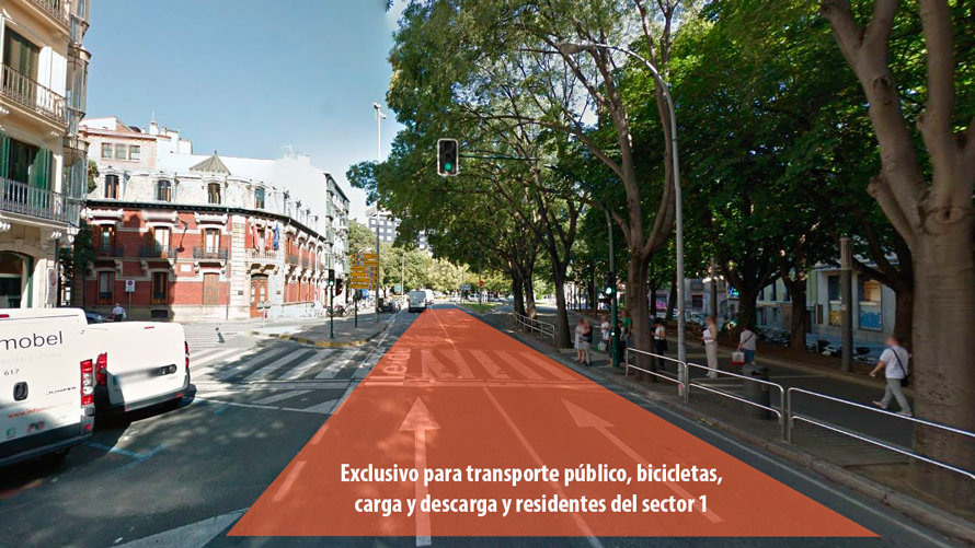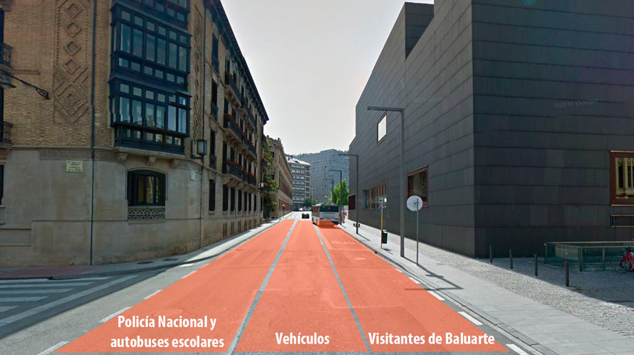 La calle Padre Moret tendrá un solo carril de circulación para vehículos. Los otros dos con los que ahora cuenta verán restringido su uso, para vehículos adscritos a la Policía Nacional en el caso del actual carril de la izquierda y para autobuses escolares y otros que puedan llegar a visitar Baluarte en el caso del carril más a la derecha.