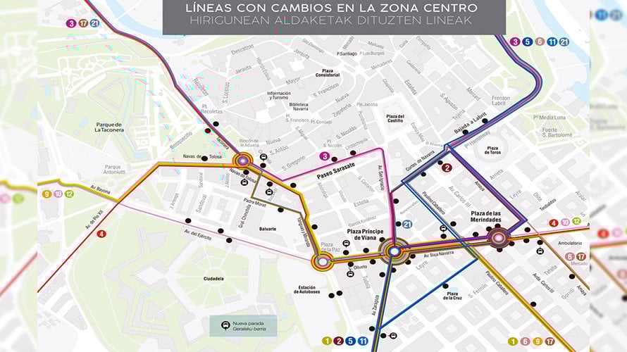 Tras las obras, prácticamente todas las líneas sufrirán variaciones en sus líneas, frecuencias y paradas. El cambio más relevante de los que se pondrán en marcha el lunes es el acercamiento al Casco Antiguo de tres de las líneas más importantes del Transporte Urbano Comarcal: las líneas 4, 9 y 12. Asimismo, se ampliarán los servicios a Zizur Mayor y al barrio de Erripagaña y se atenderán también el Soto Lezkairu.