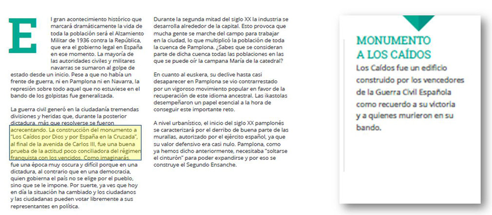 Maya ha censurado que "el monumento que más veces aparece en el material es el Monumento a los Caídos, una obsesión del alcalde, así como la guerra civil, con una presencia descomunal". "Se quiere manipular a los niños de 5º de Primaria", ha opinado, para señalar que "hasta ahora el programa era un éxito y tenía los parabienes de quienes lo han utilizado".