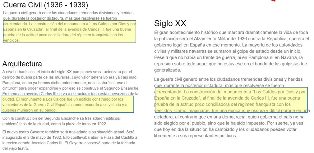 "Para finalizar con sus obsesiones, de los siglos XX y XXI, lo único digno a destacar de este periodo en nuestra ciudad es la guerra civil, el monumento a los Caídos, la censura franquista", ha indicado la edil, que ha hablado de "diversos errores cronológicos como situar al pueblo vascón únicamente en el siglo I a.C; la época romana desde el I d.C., y alargándola hasta el VIII, lo que es un error de bulto; saltándose periodos como el visigodo o la conquista musulmana, etc.", ha puesto de manifiesto.