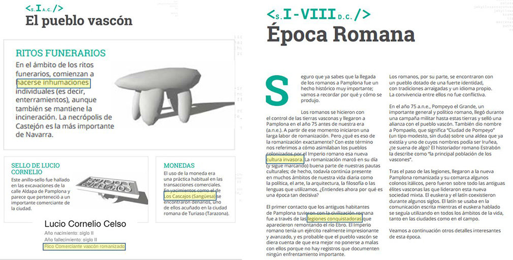 A esto, ha sumado "otra obsesión, como la de relatar la historia del pueblo vascón como la historia de un pueblo oprimido al que se ha aculturado forzosamente". Así, ha detallado cómo el lenguaje de los nuevos contenidos del 'Conozcamos Pamplona', "presentan continuamente las diversas etapas históricas como culturas invasoras, la romana, por ejemplo, en un claro intento de que los niños no sientan como propia la cultura grecolatina, que es en buena parte base de los principios que rigen nuestra actual sociedad".