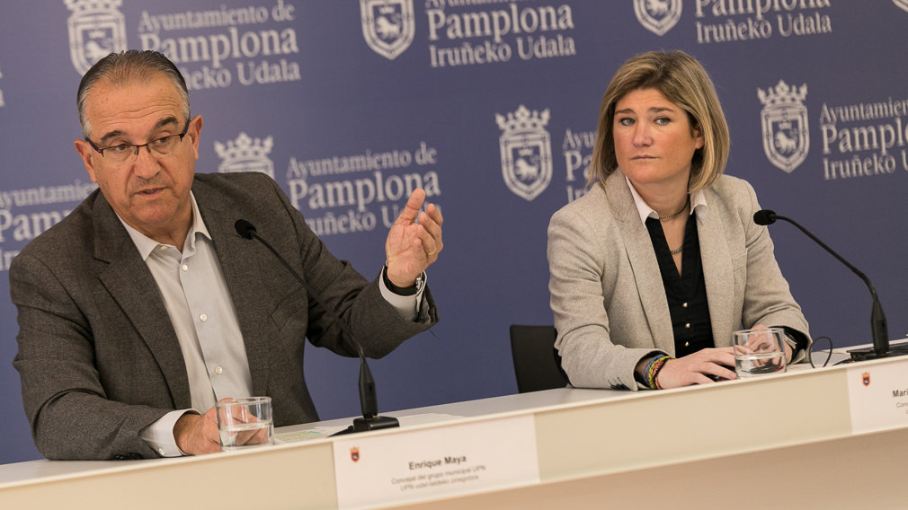 El portavoz de UPN, Enrique Maya, y la concejala María García Barberena han ofrecido una rueda de prensa para criticar el nuevo material del programa 'Conozcamos Pamplona', al considerar que "manipula" la historia de la ciudad.