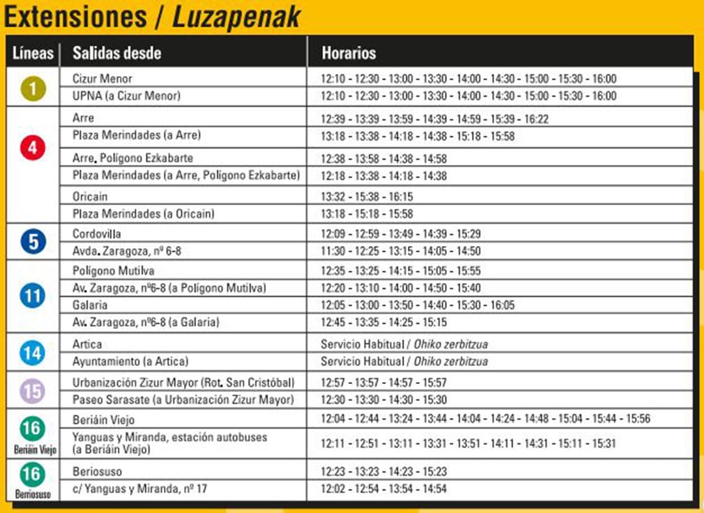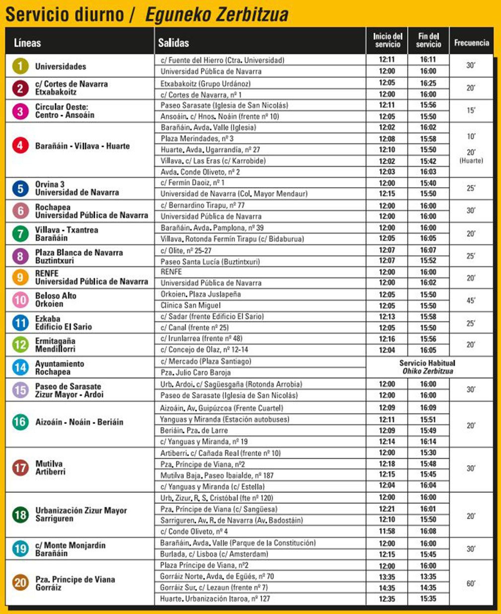 Media hora de espera habrá entre un autobús y otro en las líneas 1, que conectan las dos universidades, la 6 de la Rochapea a la UPNA, la 15 del Paseo Sarasate a Ardoi, la 17 entre Mutilva y Artiberri y la línea 19 de Barañáin a la zona del Club de Tenis.