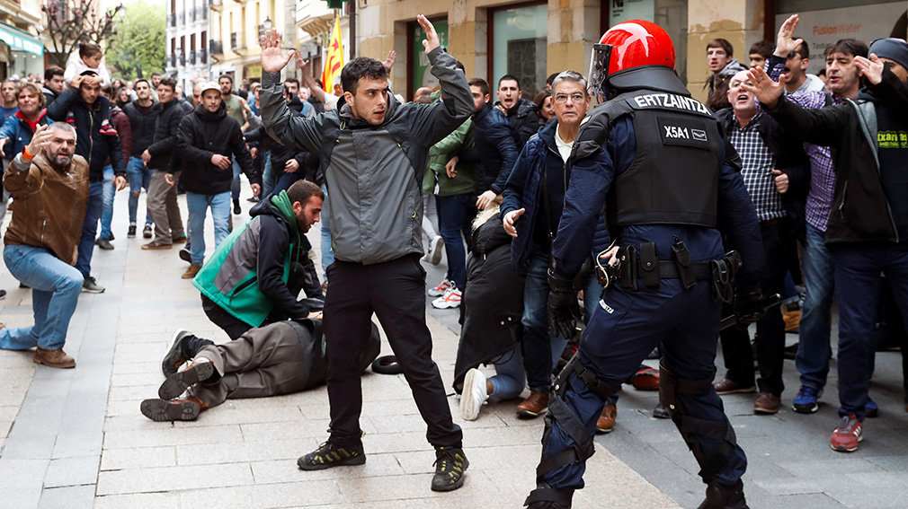 Radicales abertzales se enfrentan a la Ertzaintza tras el mitin de Albert Rivera en Rentería. EFE